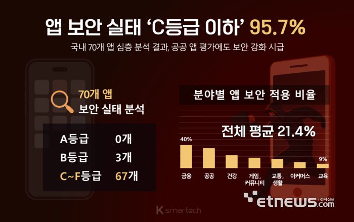 국내 인기 앱 70개 보안 실태 분석 결과 95.7% C등급 이하