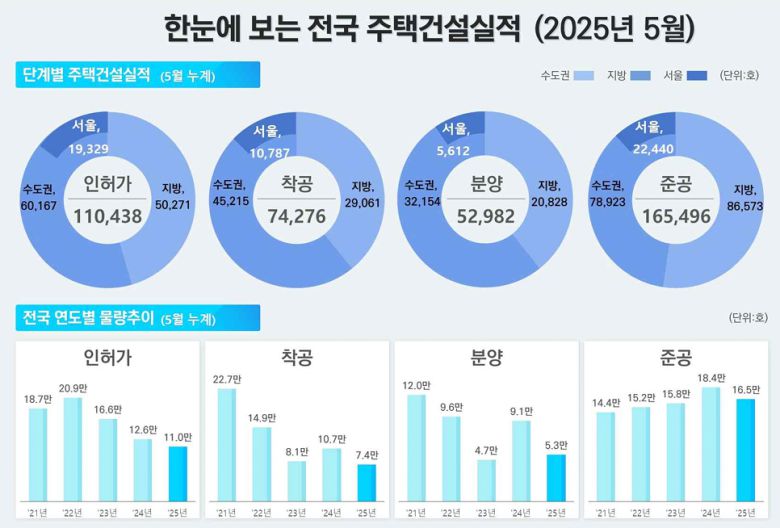 분양(승인)은 5월 1만1297호로 전월 대비 44.1% 급감했고, 누적으로도 5만2982호로 전년 동기 대비 41.7% 줄었다.