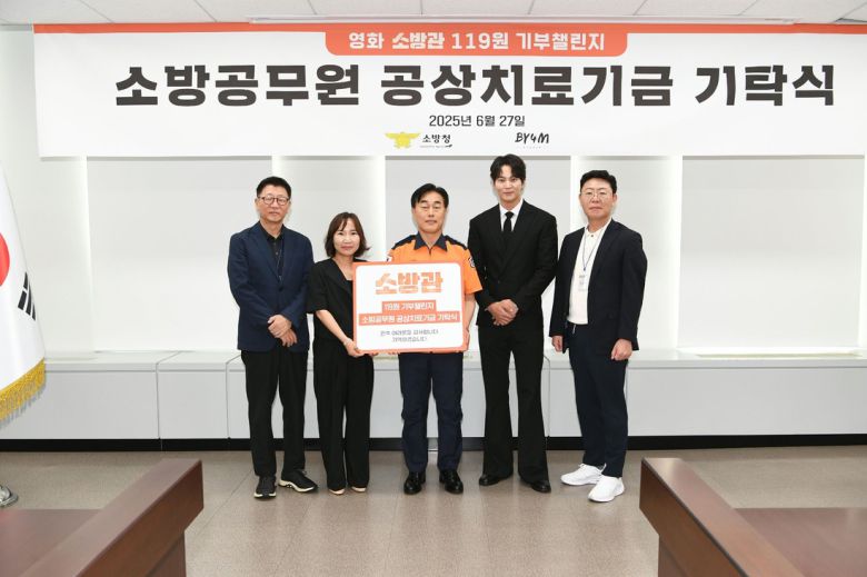 영화 <소방관>의 제작진과 출연진이 ‘1인 119원 기부 챌린지’로 모금한 기부금 4억5000만원을 소방청에 전달했다.