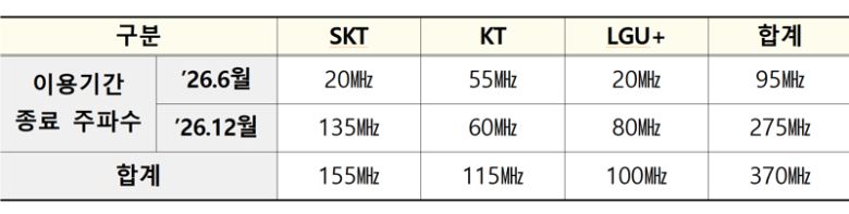 사업자별 이용기간 종료 주파수 대역폭. 과기정통부 제공