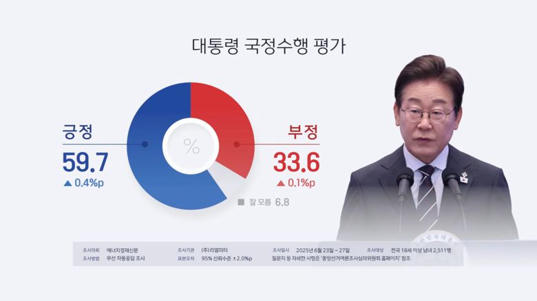 리얼미터가 에너지경제신문 의뢰로 지난 23일부터 닷새 동안 전국 18세 이상 유권자 2,511명을 대상으로 조사한 결과, 이재명 대통령이 국정 수행을 잘한다는 답변은 59.7%로 집계됐습니다.