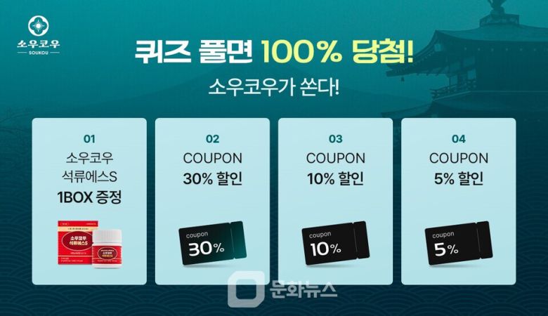 이번 이벤트는 소우코우 제품과 관련한 초성퀴즈를 제공하고 이를 통해 매일 선착순 100명에게 다양한 혜택을 제공한다. 참여자들은 퀴즈를 풀고 정답을 맞히면, 소우코우 석류에스S 1박스 증정과 최대 30% 할인 쿠폰을 받을 수 있다.