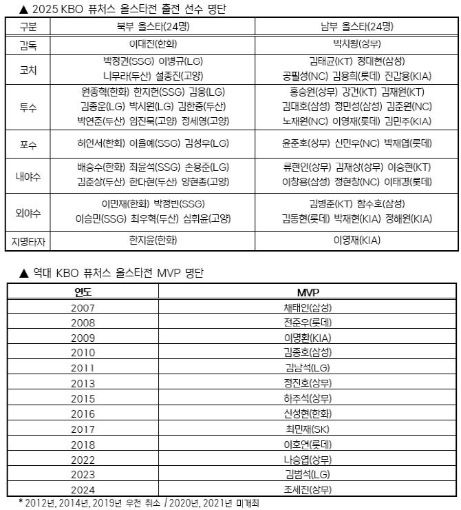 KBO는 30일 퓨처스 올스타전에 나설 북부리그(한화, SSG, LG, 두산, 고양)와 남부리그(상무, KT, 삼성, NC, 롯데, KIA) 대표 명단을 발표했다. 각 팀 24명씩 총 48명이 퓨처스 올스타전에 참가한다.