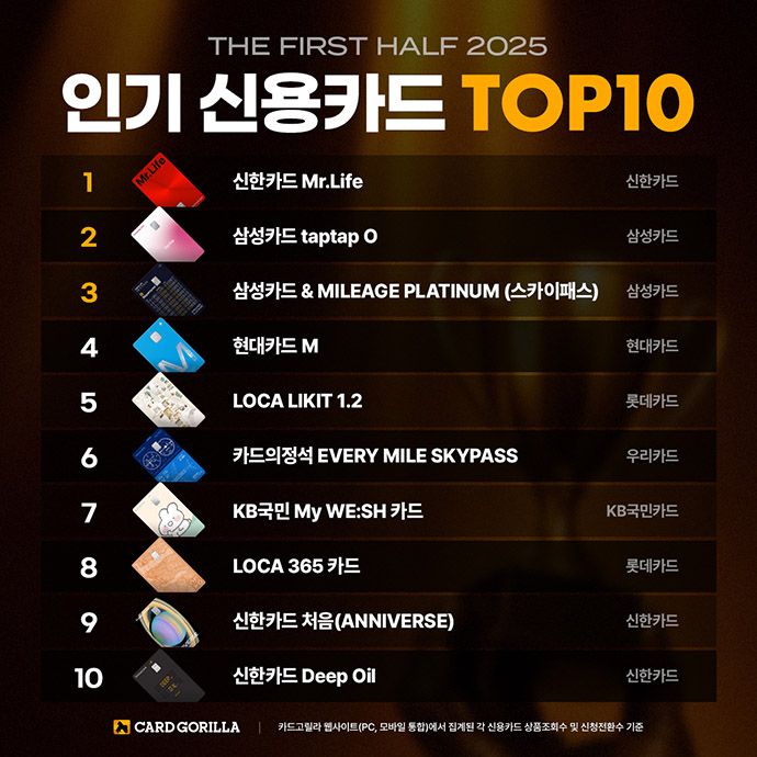 국내 최대 신용카드 플랫폼 카드고릴라가 '2025년 상반기 인기 신용카드 TOP 10'을 발표했다. '신한카드 Mr.Life'가 1위에 올랐다. 이번 집계는 1월 1일부터 6월 22일까지 카드고릴라 웹사이트(PC, 모바일 통합)에서 집계된 각 신용카드 상품조회수 및 신청전환수를 기준으로 매겨졌다.
