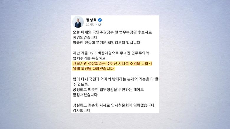 정 후보자도 어제 SNS에서 '권력기관 정상화라는 시대적 소명을 다하기 위해 최선을 다하겠다'고 소감을 밝혔죠.