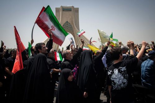 지난 28일(현지시간) 이란 테헤란의 엥겔라브 광장에서 열린 장례 행진에 이란 시민들이 참석해 애도하고 있다. UPI연합뉴스