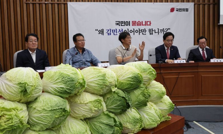국민의힘 송언석 원내대표와 김경률 회계사 등 참석자들이 30일 서울 여의도 국회에서 배추를 앞에 두고 '김민석 국무총리후보 국민청무회'를 열고 있다. 회의장에 놓인 배추는 김 후보자가 과거 불법정치자금 사건 공여자로부터 미국 유학 시절 매달 450만원 가량을 제공받았다는 의혹을 두고 '배추농사 투자 수익 배당금'이라고 주장한 점을 계속 쟁점화하기 위한 의도로 해석된다. 허정호 선임기자 |