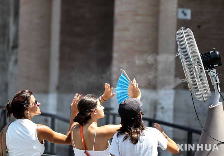 [로마=신화/뉴시스] 남유럽 일부 지역 기온이 46도까지 치솟고 야외 노동자가 사망하는 등 유럽 폭염이 심각한 수준으로 이어지고 있다. 사진은 27일(현지 시간) 이탈리아 로마 콜로세움 인근에 설치된 선풍기 앞에서 관광객들이 더위를 식히는 모습. 2025.06.30. |