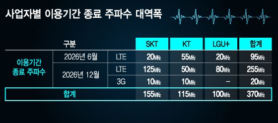 현재 LTE 95㎒폭은 내년 6월, 3G 20㎒폭·LTE 255㎒폭 등 275㎒은 같은 해 12월 이용 기간이 만료된다. 3G 주파수는 현재 최소 주파수 대역폭(SK텔레콤 10㎒폭, KT 10㎒폭 총 20㎒폭)을 사용해 서비스를 제공 중이다. LG유플러스는 2G 이후 LTE로 직행해 3G 이용자가 없다.