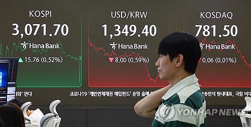코스피 상승ㆍ코스닥 하락 마감…원/달러 환율은 하락(서울=연합뉴스) 서대연 기자 = 30일 서울 중구 하나은행 본점 딜링룸 현황판에 코스피, 원/달러 환율, 코스닥 지수가 표시돼 있다.     이날 코스피는 전 거래일 대비 15.76p(0.52%) 오른 3,071.70로, 코스닥 지수는 전장보다 0.06p(0.01%) 내린 781.50으로 마감했다. 원/달러 환율 주간 거래 종가(오후 3시 30분 기준)는 전날보다 원/달러 환율 7.4원 내린 1,350.0원을 기록했다. 2025.6.30 dwise@yna.co.kr