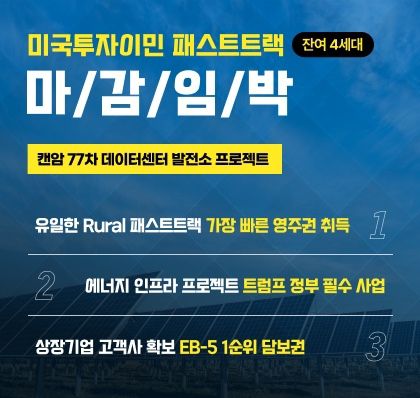 US컨설팅그룹은 지난 주까지 패스스트랙 미국투자이민 사전 모집을 통해 이미 한국에 배정된 쿼터 절반을 이미 모집한 것으로 알려졌다. 또한 이번 루럴 데이터센터 발전소 프로젝트는 빠른 영주권 취득과 안정적인 투자 상환 조건을 모두 갖추고 있는 미국투자이민 프로젝트이므로 다음달까지 투자자 모집을 마칠 것이라고 전했다.