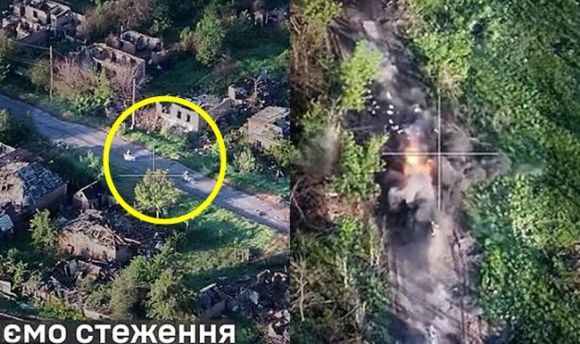 오토바이를 타고 이동 중인 러시아 병사를 상대로 우크라이나 드론이 폭탄을 떨어뜨리고 있다. 자료사진 |