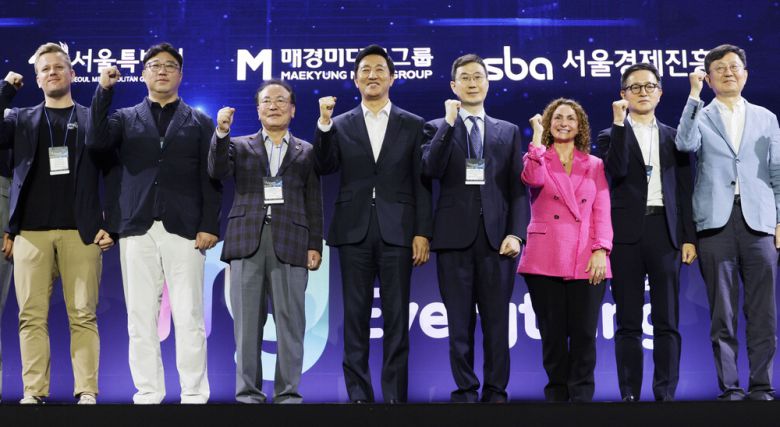 지난해 9월 열린 '트라이 에브리싱' 개막식에서 오세훈 서울시장, 장승준 매경미디어그룹 부회장, 라일라 이브라힘 구글 딥마인드 최고운영책임자(왼쪽 넷째부터) 등 주요 참석자들이 기념촬영을 하고 있다. 매경DB
