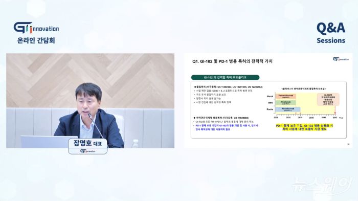 장명호 지아이이노베이션 대표가 30일 열린 간담회에서 GI-102 및 PD-1 병용 특허의 전략적 가치에 대해 설명하고 있다. 자료=지아이이노베이션 공식 유튜브 캡처 |