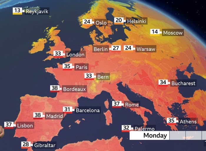 유럽 대부분 지역은 다음 주 중반까지 기온이 계속 오를 전망이다. 프랑스, 독일, 영국, 이탈리아 등은 향후 며칠간 폭염이 정점에 이를 것으로 보인다. 영국 기상청은 주말 동안 잉글랜드 남부에 황색·주황색 경보를 발령했으며, 런던의 기온은 오는 1일 기준 35℃에 이를 수 있다고 예보했다.