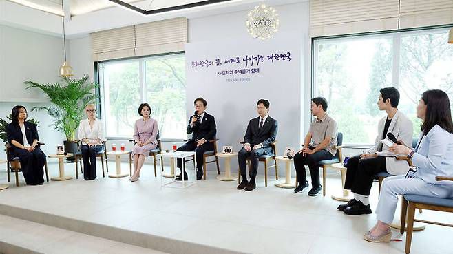 이재명 대통령은 30일 대통령실 청사 앞 잔디밭 '파인그라스'에서 문화예술계 인사들을 초청해 문화콘텐츠산업 발전 방안에 대한 대화를 나눴다.