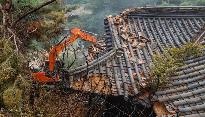 소방당국은 기둥이 심하게 타고 지붕 내부 기와 위쪽으로도 연기가 발생해 국가유산청과 협의 끝에 지붕을 파괴했다. 이로 인해 마루에서 지붕까지 약 3분의 1이 무너졌다. 기와지붕 구조상 물이 잘 들어가지 않아 굴삭기·포크레인 등을 동원해 방수 작업을 할 수밖에 없었다는 것이 소방당국 설명이다.
