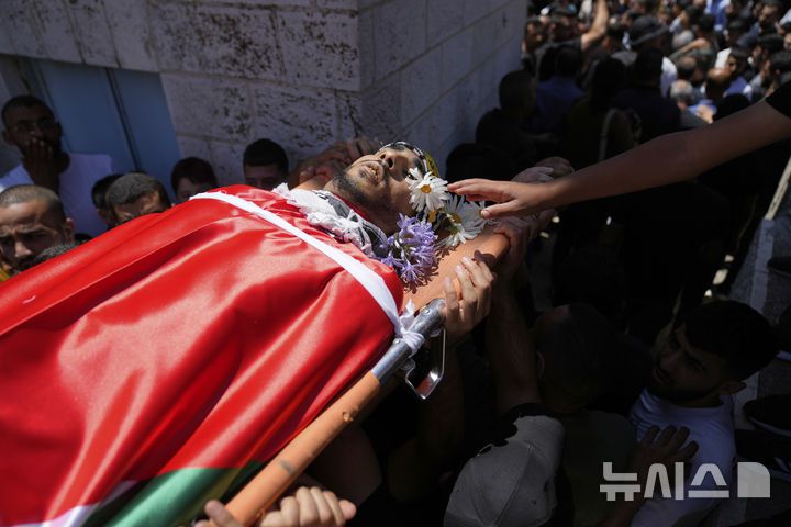 [카프르 말리크(요르단강 서안)=AP/뉴시스]지난 25일 극우 유대인 정착민들의 요르단강 서안 카프르 말리크 마을 공격으로 숨진 한 팔레스타인 남성의 장례식이 26일 치러지고 있다. 요르단강 서안의 이스라엘 정착민 수십명이 29일 밤 요르단강 서안의 이스라엘 군사기지 주변에서 불을 지르고 군용 차량을 파손하고 군인들을 공격했다고 이스라엘 군 당국이 30일 밝혔다. 이는 지난 25일100명이 넘는 이스라엘 정착민들이 요르단강 서안 크파르 말리크 마을을 불태우고 팔레스타인인들에게 총격을 가해 이스라엘군이 정착민 5명을 체포한 데 분노했기 때문이다. 2025.06.30. |