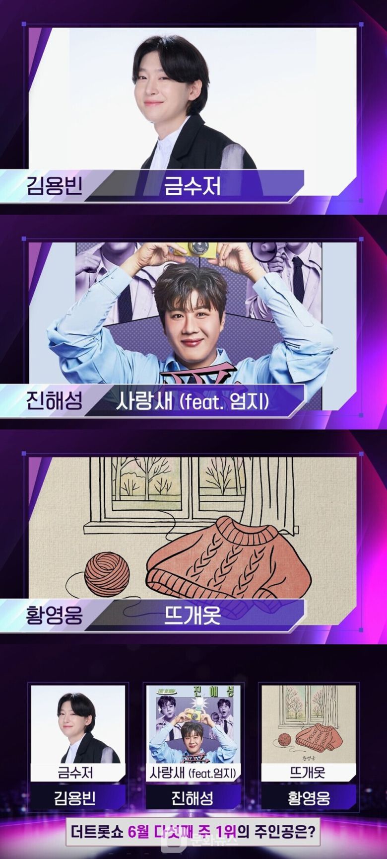 6월 30일 생방송으로 진행되는 '더 트롯쇼'에서는 김용빈의 '금수저', 진해성의 '사랑새', 황영웅의 '뜨개옷'이 1위 후보에 올랐다.