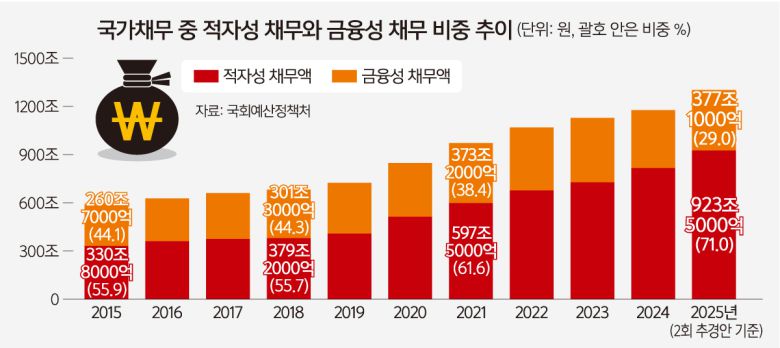 국가채무가 늘어나며 적자성 채무도 923조5000억원으로 증가했다. 적자성 채무는 대응자산이 없는 국고채 등으로, 조세 등 일반재원으로 상환해야 하는 채무다. 이는 외평채나 국민주택채권처럼 자체 회수가 가능한 ‘금융성 채무’와는 다르다.