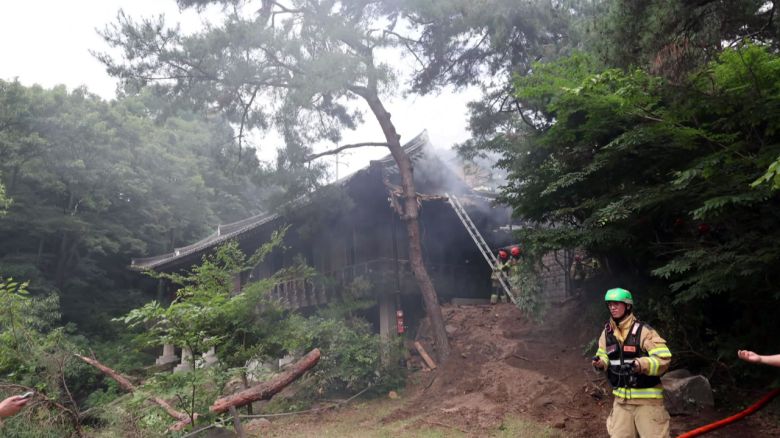 목조 건물을 타고 불길이 계속 번지자 소방은 결국 건물 일부를 뜯어내기로 결정했습니다.
