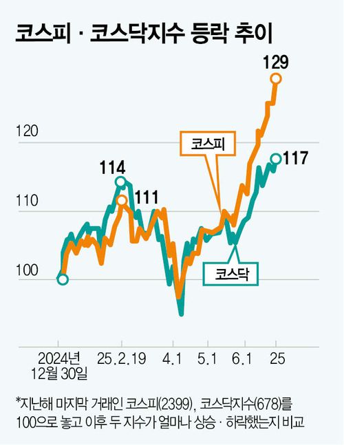 전문가들은 두 시장 간 상승률 격차가 종목 구성에서 비롯됐다고 분석한다. 김현 다올투자증권 리서치본부장은 “코스닥 시장은 2차전지와 바이오 비중이 크다”며 “2차전지는 미국의 인플레이션 감축법(IRA) 법안에 따른 보조금 축소 영향으로 부진했고, 바이오 역시 의약품 관세 불확실성 등 외부 변수로 약세를 보였다”고 분석했다.