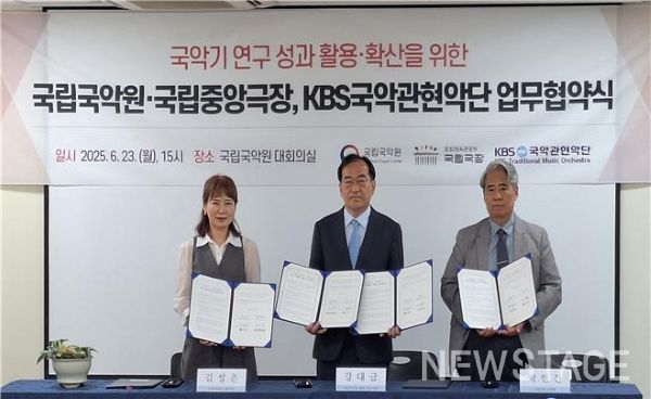 문화체육관광부 국립국악원(원장 직무대리 강대금)은 지난 23일(월), 국립중앙극장(극장장 박인건), KBS국악관현악단(KBS시청자센터장 김성은)과 함께 국악기 연구성과의 확산과 창작 연계를 위한 업무협약을 체결했다.