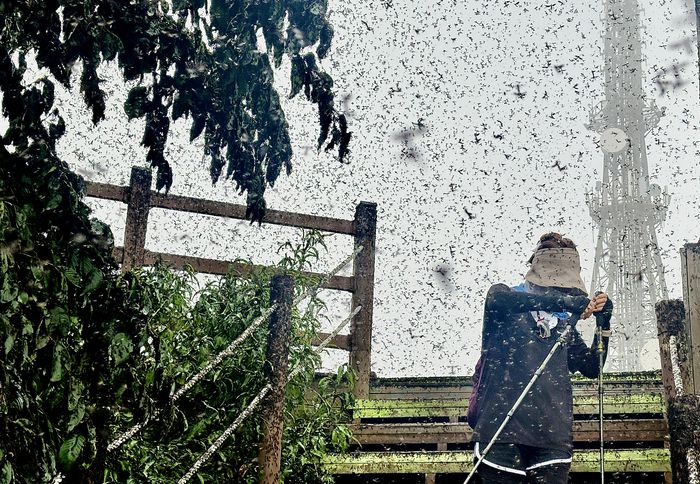 지난 29일 인천 계양구 게양산 정상에서 러브버그(붉은등우단털파리) 무리가 등산로와 등산객들에게 들러붙으며 불쾌감을 주고 있다. [사진 = 인천일보] |