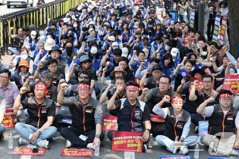 MG손해보험 전직원들이 29일 서울 종로구 금융위원회 앞에서 열린 총파업 선포 결의대회에서 일부영업정지를 규탄하는 구호를 외치고 있다. 2025.5.29/뉴스1 ⓒ News1 허경 기자