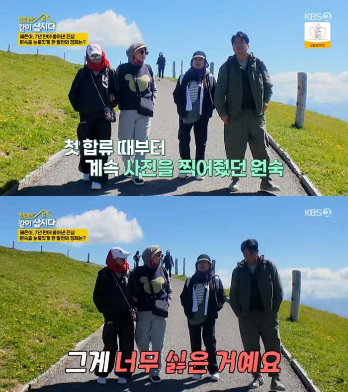 이날 박원숙, 혜은이, 홍진희, 윤다훈은 리기산 정상에서 아래를 내려다봤다. 혜은이는 “나 자신이 너무 초라하고 보잘것없게 느껴진다. 아직 풀지 못한 미움들이 있는데 여기 와서 그런 것들을 다 버려야겠다고 생각했다”고 털어놨다.