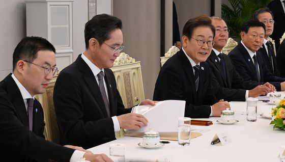 이재명 대통령은 지난달 13일 서울 용산 대통령실 청사에서 간담회를 열고 5대 그룹 총수와 경제단체장들을 만났다. 왼쪽부터 구광모 LG그룹 회장, 이재용 삼성전자 회장, 이 대통령, 정의선 현대자동차그룹 회장, 신동빈 롯데그룹 회장. [사진 대통령실사진기자단] |