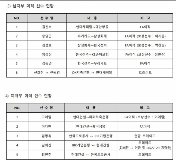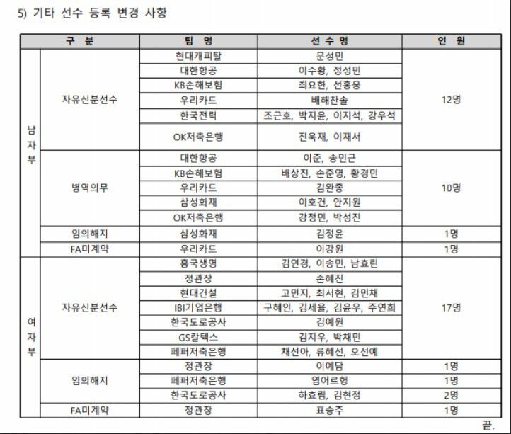 한편, 남자부 12명, 여자부 16명 등 총 28명의 선수가 자유신분선수로 등록되었으며 자유신분선수는 공시일로부터 정규리그 3라운드 종료일까지 어느 구단과도 자유롭게 계약을 맺을 수 있다. 자세한 선수 등록 관련 정보는 한국배구연맹 홈페이지(www.kovo.co.kr)에서 확인할 수 있다.