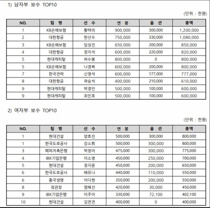 남자부 ‘연봉킹’은 KB손해보험의 주전 세터 황택의다. 황택의는 보장 연봉 9억원에 옵션 3억원을 합쳐 총액 12억원을 받는다. 대한항공 주전 세터 한선수가 보수 총액 10억8000만원(연봉 7억5000만원, 옵션 3억3000만원)으로 그 뒤를 이었고, FA자격을 얻어 한국전력에서 KB손해보험으로 둥지를 옮긴 임성진이 총액 8억5000만원(연봉 6억5000만원, 옵션 2억원)으로 3위에 올랐다. FA 자격을 얻어 대한항공에 잔류한 정지석이 보수 총액 8억2000만원(연봉 6억원, 옵션 2억2000만원)으로 4위, 현대캐피탈 허수봉(연봉 8억원)과 KB손해보험 나경복(연봉 6억원, 옵션 2억원)이 총액 8억원으로 나란히 5위에 자리했다.