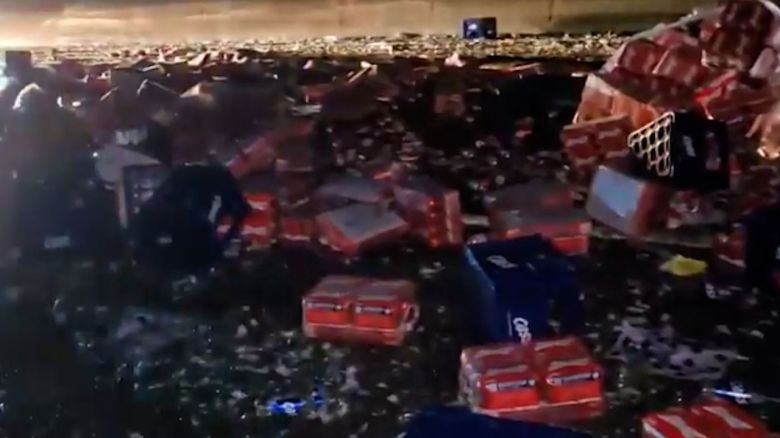 이 사고로 25톤 화물차가 옆으로 넘어지면서 그 안에 실려 있던 맥주 수만 병이 도로에 쏟아졌습니다.