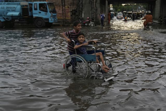 ▲29일(현지시간) 파키스탄 라호르에서 폭우로 도로가 침수된 가운데 한 어린이가 다른 어린이를 휠체어에 태워 가고 있다. ⓒAP=연합뉴스 |