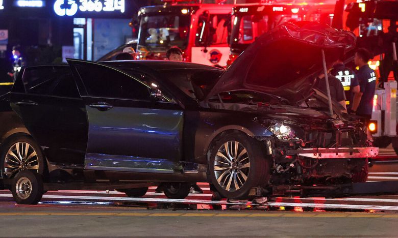2024년 7월 2일 오전 전날 대형 교통사고가 발생한 서울 시청역 인근 교차로에서 경찰이 완전히 파괴된 차량 한 대 주변을 통제하고 있다. 연합뉴스
