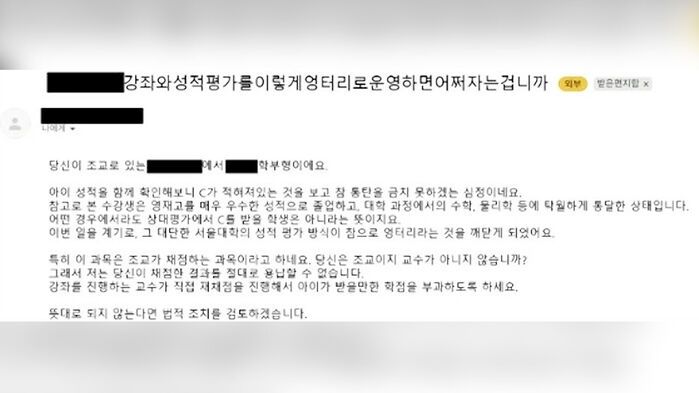 서울대학교에서 한 학부모가 자녀 성적에 불만을 품고 조교에게 직접 항의성 이메일을 보낸 사실이 알려져 논란이 일고 있습니다.