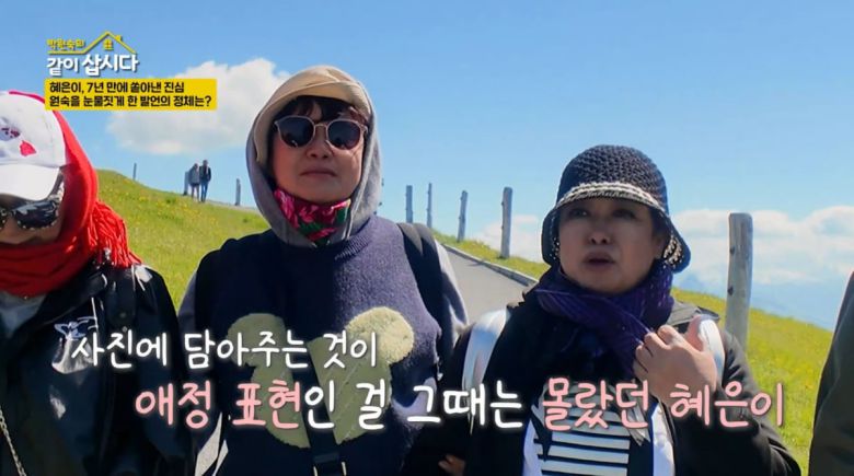 혜은이는 문득 생각나듯 '같이 삽시다' 초반 이야기를 꺼냈다. 그는 "처음 합류했을 때 제 상황이 나쁘기도 나빴다. 그런데 고모(박원숙)가 계속 사진을 찍어주더라. 그게 너무 싫더라"라고 털어놨다.