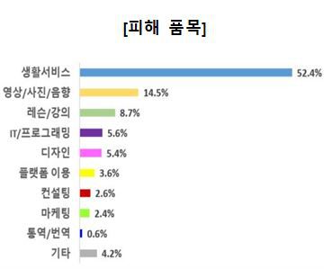 조사에 따르면 '생활서비스' 관련 피해는 전체의 52.4%(261건)로 가장 많았으며, 이어 영상·사진·음향 14.5%(72건) 레슨·강의 8.7%(43건) IT·프로그래밍 5.6%(28건) 순으로 나타났다. 생활서비스 중에서는 '청소서비스'가 17.5%(87건), '인테리어 서비스'가 16.3%(81건)로 높은 비중을 차지했다.
