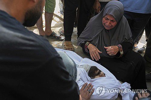 Israel Palestinians(AP=연합뉴스) 이스라엘군의 가자시티 카페 공습으로 사망한 팔레스타인 저널리스트 이스마일 아부 하타브의 모친이 아들의 시신 옆에서 흐느끼는 모습. 2025.6.30