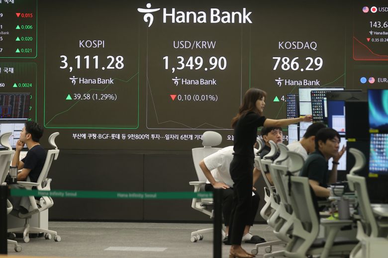 하반기 첫 거래일인 1일 코스피가 3090선에서 상승 출발했다. 이날 서울 중구 하나은행 본점 딜링룸 현황판에 코스피, 원/달러 환율이 표시돼 있다. [연합] |