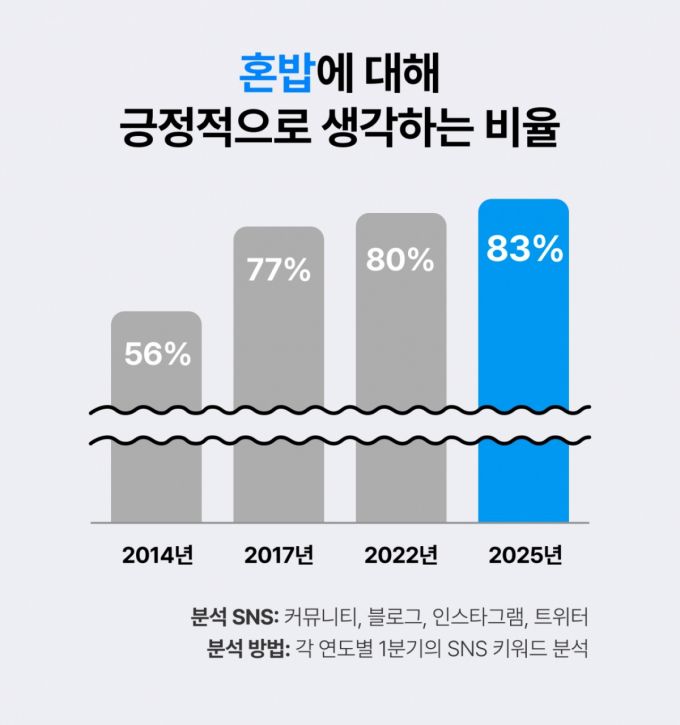1인 가구 증가, 배달 시장의 성장으로 혼밥을 익숙하게 느끼는 소비자들도 빠르게 늘고 있다. 실제 배민 자체 조사에 따르면 SNS에서 혼밥에 대해 긍정적으로 반응한 소비자는 2014년 56%에서 2025년에는 83%로 급증했다.