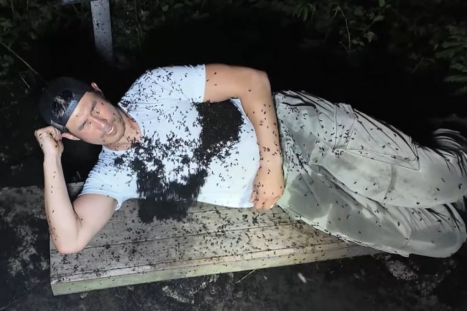 괴식 먹방 유튜버 이충근이 인천 계양산에서 러브버그를 채집하고 있다. /사진=유튜브 갈무리