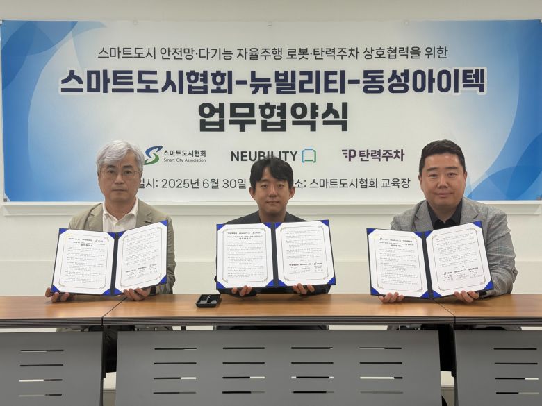 지능형 로봇 서비스 플랫폼 기업 뉴빌리티(대표 이상민)는 스마트도시협회(회장 박동선) 및 스마트 주차 플랫폼 기업 동성아이텍(대표 이용석)과 ‘미래형 도시 서비스 구축’을 위한 3자 업무협약(MOU)을 체결했다고 1일 밝혔다.
