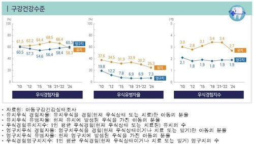 이번 조사 결과 충치 예방과 관련된 지표들이 전반적으로 좋지 않았다. 영구치에 충치 예방 효과가 높은 치아 홈 메우기를 시행한 12세 어린이는 전체의 57.7%로 이전 조사에 비해 8.4%포인트 줄었다. 점심식사 후 칫솔질 실천율은 22.6%로 코로나19 대유행 당시인 2021~2022년 조사보다는 7.4%p 늘었지만 그 이전인 2018년 33.3% 수준에는 미치지 못한다.