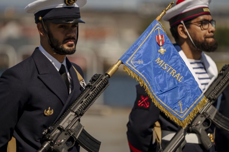 덴마크 코펜하겐 항구에서 30일(현지시간) 선원과 초청객들이 프랑스 상륙함 PHA 미스트랄호 리셉션에 참여하고 있다. [EPA]
