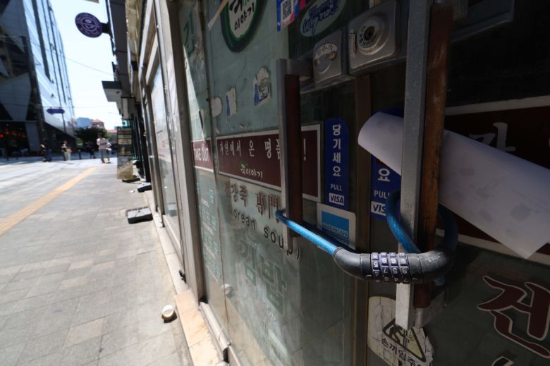 내수 경기 침체가 장기화되면서 자영업자들의 대출이 꾸준히 늘고 있다. 12일 한국은행에 따르면 올해 1분기, 대표적인 내수 업종인 숙박업과 음식점업의 대출 잔액은 90조 4269억 원으로 집계됐다. 숙박업과 음식점업 대출이 90조 원을 넘어선 건 이번이 처음이다. 전 분기보다 1조 4000억여 원 증가한 것으로, 이는 코로나19 사회적 거리 두기가 해제된 직후인 지난 2022년 3분기 이후 2년 6개월 만에 가장 큰 증가폭이다. 이날 서울의 한 폐업한 음식점에 자물쇠가 걸려 있다. 신태현 기자 holjjak@ |