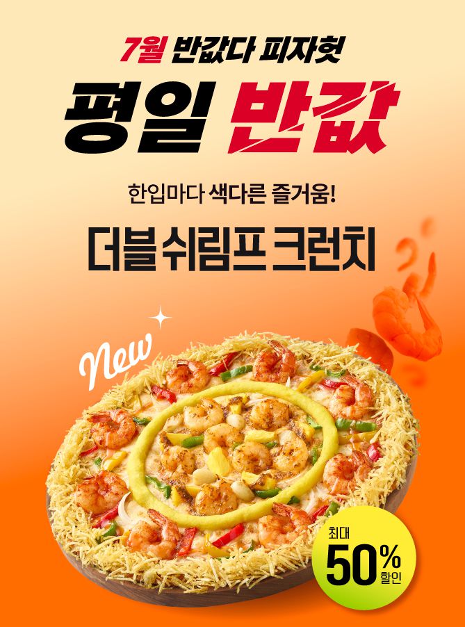 이달에는 평일 반값 혜택 대상 피자로 ‘더블 쉬림프 크런치’를 선정했다.