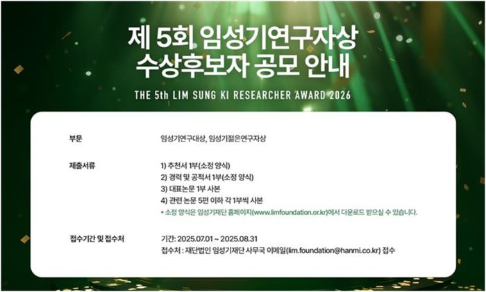임성기재단이 다음 달 31일까지 '제5회 임성기연구자상' 수상 후보자를 공모한다고 1일 밝혔다.