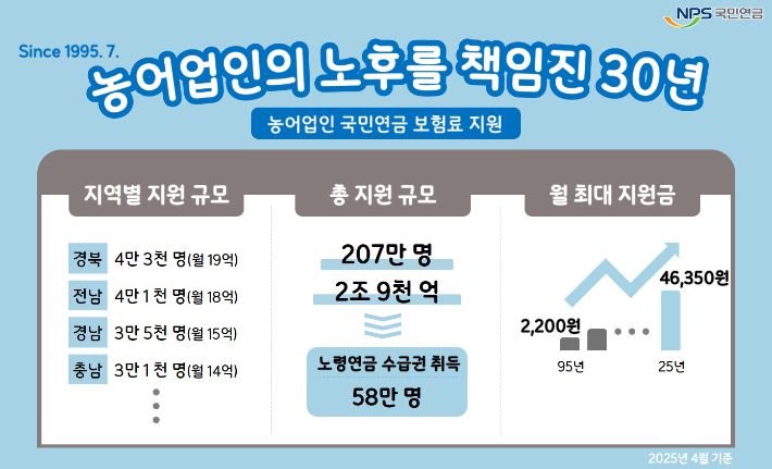 국민연금공단은 1일 "농어업인의 노후소득 보장을 위해 1995년부터 운영 중인 농어업인 연금보험료 지원 제도가 도입 30년 만에 총 207만 명에게 보험료를 지원했고, 이 중 58만 명은 노령연금 수급권을 취득했다"고 밝혔다.